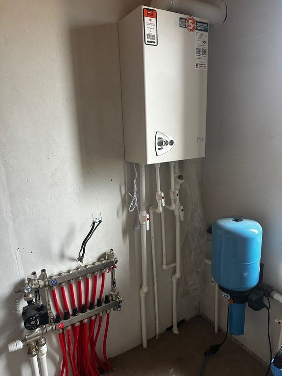 - Установлен качественный мощный газовый котел 24-киловатт.Система отопления теплый пол, выходы под радиаторы.